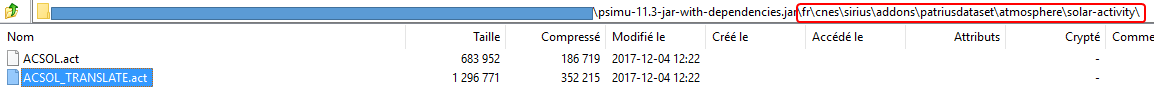 - then go inside the archive in the fr/cnes/sirius/addons/patriusdataset/atmosphere/solar-activity directory => you will see two files (ACTSOL.act corresponding to the "real one" and ACSOL_TRANSLATE.act corresponding to 11 years cycle translated data)
