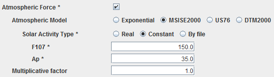 For both MSISE2000 and DTM2000 models, the user will have to enter solar activity information with these three possibilities: