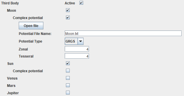 The user can select which other body will interact with the trajectory thanks to its potential attraction. Of course, the user can select several of these bodies (as Sun and Moon for example). Since V11.6.x, there is the possibility to use complex potential fields.