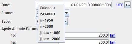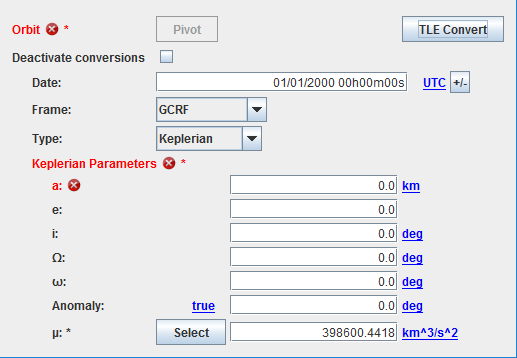At every moment, the user may change the “pivot” definition by clicking on the dedicated button. On the other side, if the user modifies an entry (as the eccentricity when Keplerian parameters), the “pivot” will be automatically modified (as we will be on a new orbit). On the same idea, if the user modifies the “µ” value (or equatorial radius or flatness), the orbit will also be modified. Nevertheless, a conversion will be done as it could be useful to see the influence of such constants. Moreover, it is always possible to disconnect this conversion possibility: indeed, it is a basic case when the user started to enter orbital parameters before choosing the right frame!
