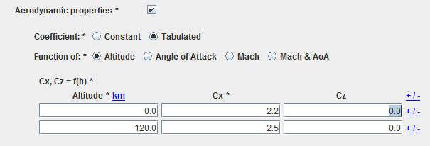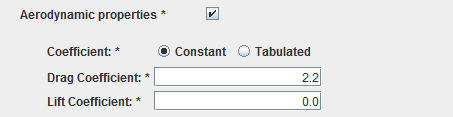 For most of the cases, the aerodynamic characteristics will only consist in constant drag and lift coefficient values.