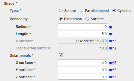 In this item, the user will define the shape. Only sphere, parallelepiped and cylinder are proposed. Note that the user has the possibility to enter either dimensions or surfaces. There is also the possibility to add solar panels by entering areas perpendicular to each vehicle axis: for example, X surface will correspond to the area perpendicular to the x axis.