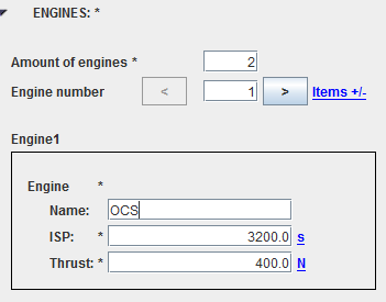 Propulsive properties will define the engines and the tanks existing in the vehicle (of course, by default, there is no engine and no tank). These definitions could have appeared in the maneuver sequence tab but it has been decided to keep them in the vehicle tab as it seemed more natural to group all vehicle data at the same place. For the engines, the user will have access to a list, each element of the list is composed of the name, the thrust level and the specific impulse.